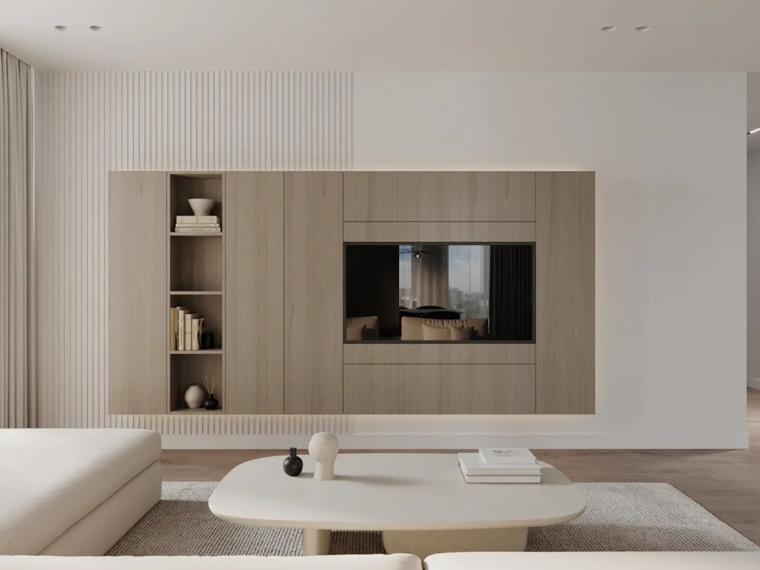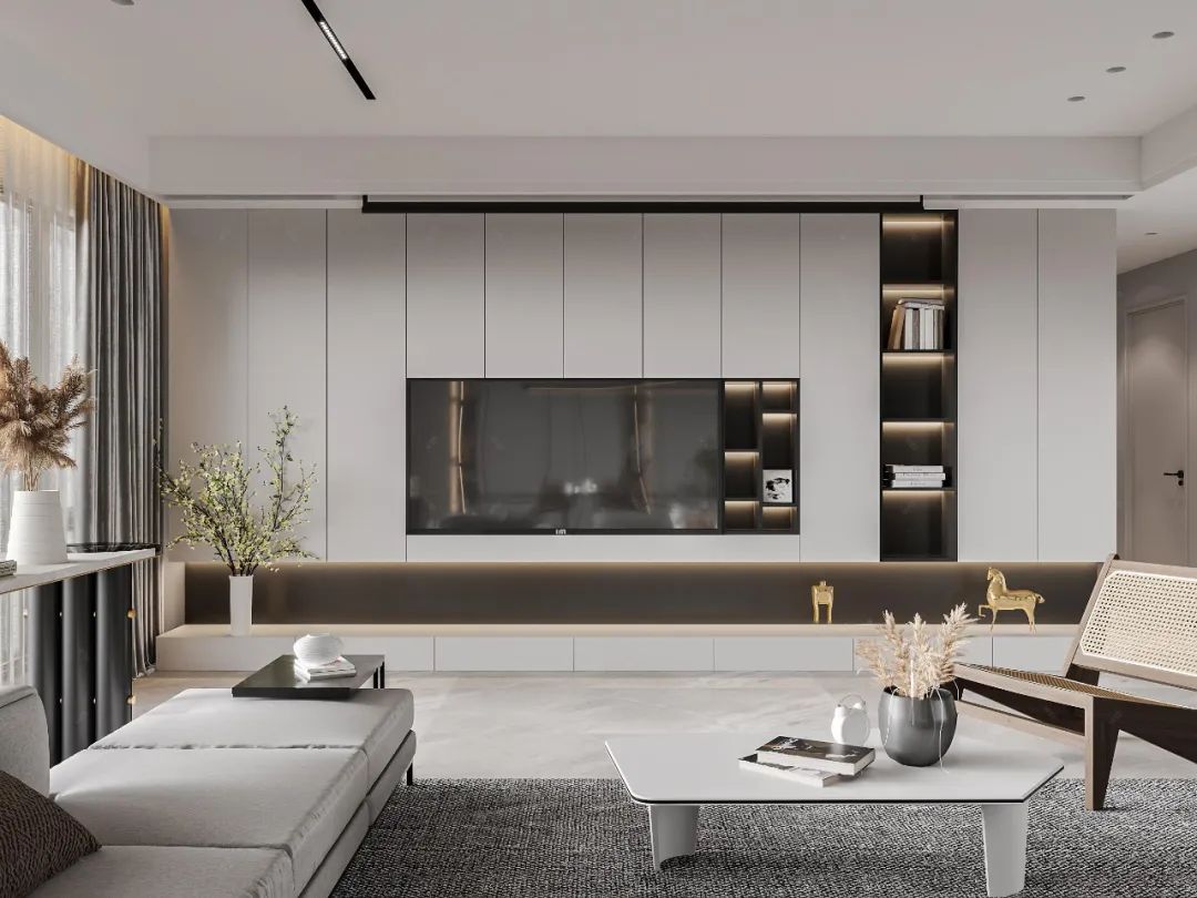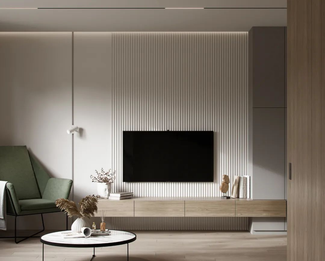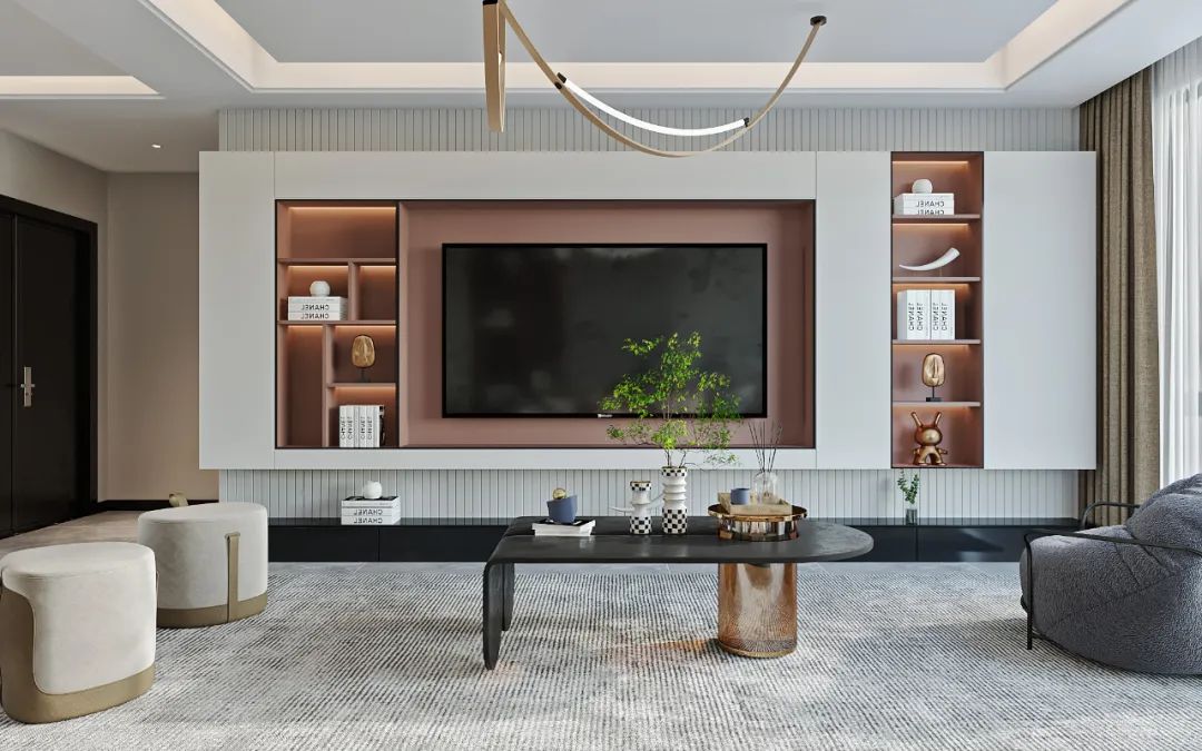 Για μικρότερα διαμερίσματα, ένα πλήρες τοίχο τηλεοπτικό ντουλάπι μπορεί να αισθάνεται καταπιεστικό. Ένα ανασταλτικό, κομψό τηλεοπτικό ντουλάπι μπορεί να μειώσει αποτελεσματικά την αίσθηση της βαρύτητας, απλοποιώντας και επέκτεινε το χώρο διαβίωσης. Ενισχύει την πολυπλοκότητα του καθιστικού και ευνοείται ιδιαίτερα από τους νέους.