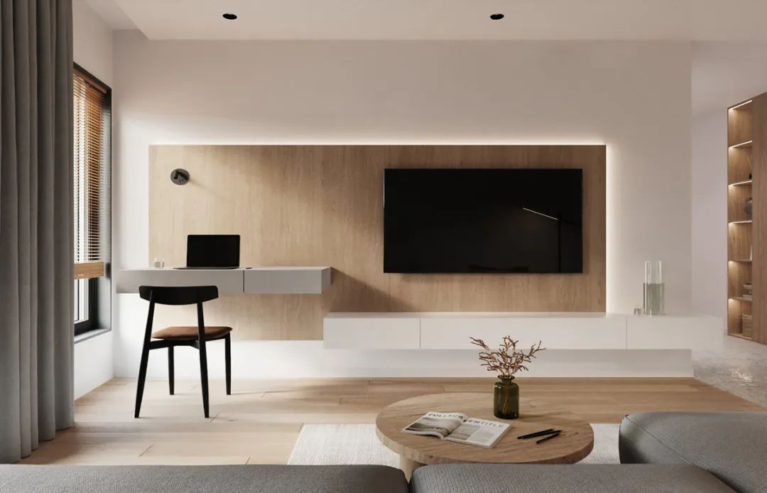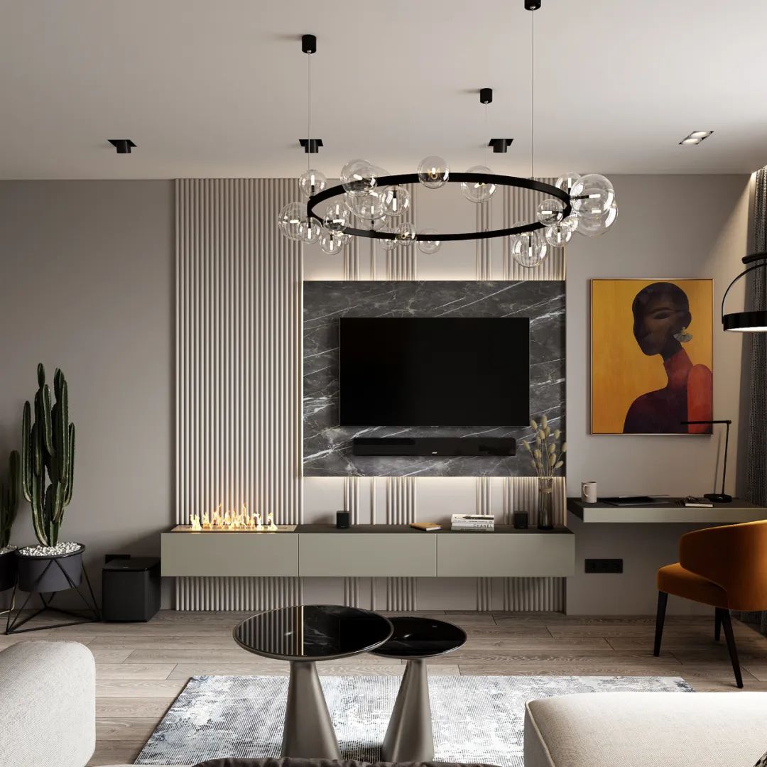 Ο ανασταλτικός σχεδιασμός δεν περιορίζεται στα γραφεία. Ένας ανασταλεός τοίχος τηλεόρασης που χρησιμεύει ως χωρικός διαιρέτης είναι μια δημοφιλής επιλογή αυτές τις μέρες, προσθέτοντας ένα άγγιγμα κομψότητας στο σπίτι.