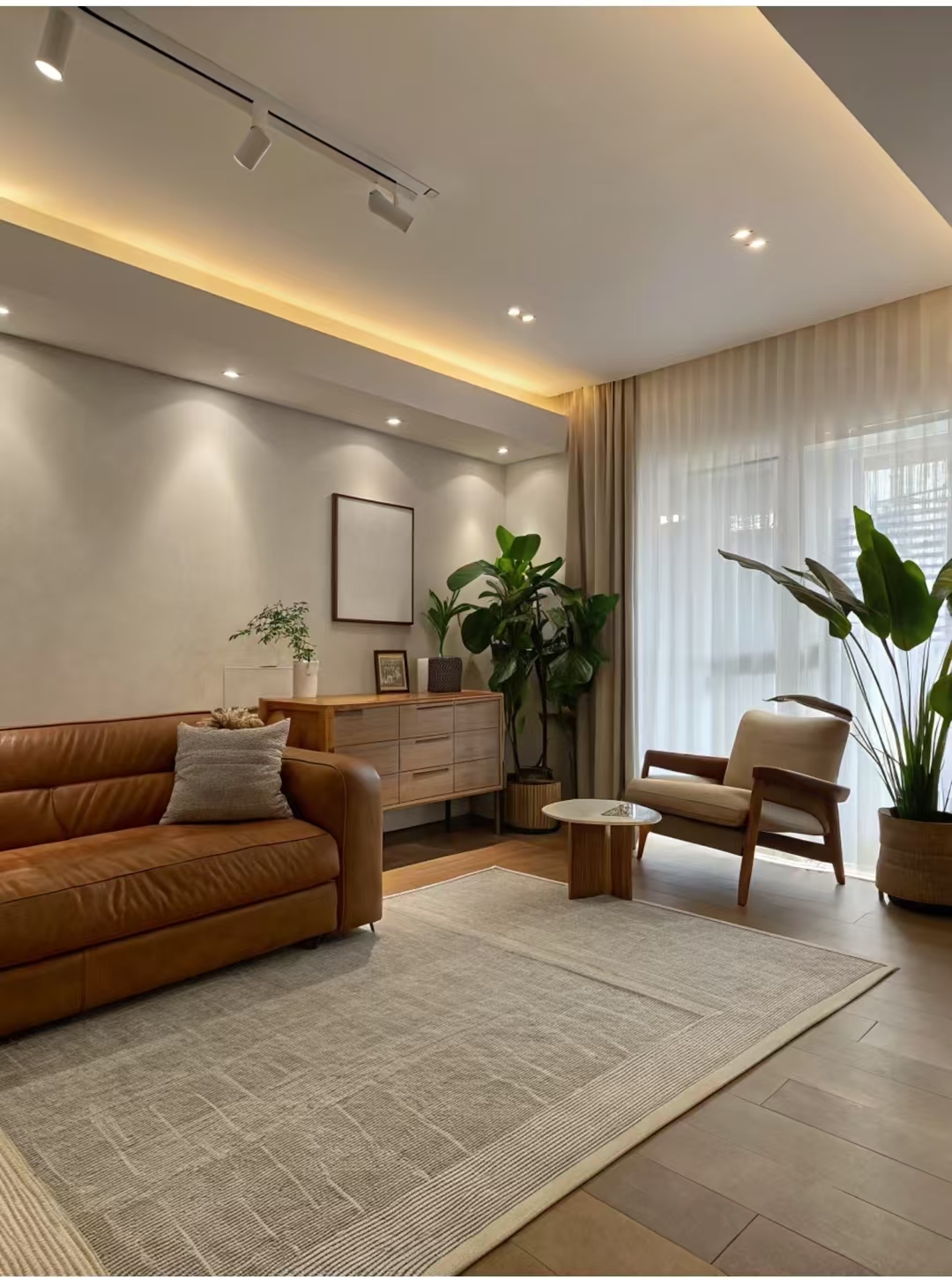 Τα ελαφρά μπεζ τοιχώματα συμπληρώνουν τα ζεστά ξύλινα δάπεδα, αποπνέοντας μια φυσική ατμόσφαιρα. Ο καφέ δερμάτινος καναπές, με την πλούσια υφή του, σε συνδυασμό με πολλά μαλακά μαξιλάρια, σας προσκαλεί να βυθίσετε δεξιά.