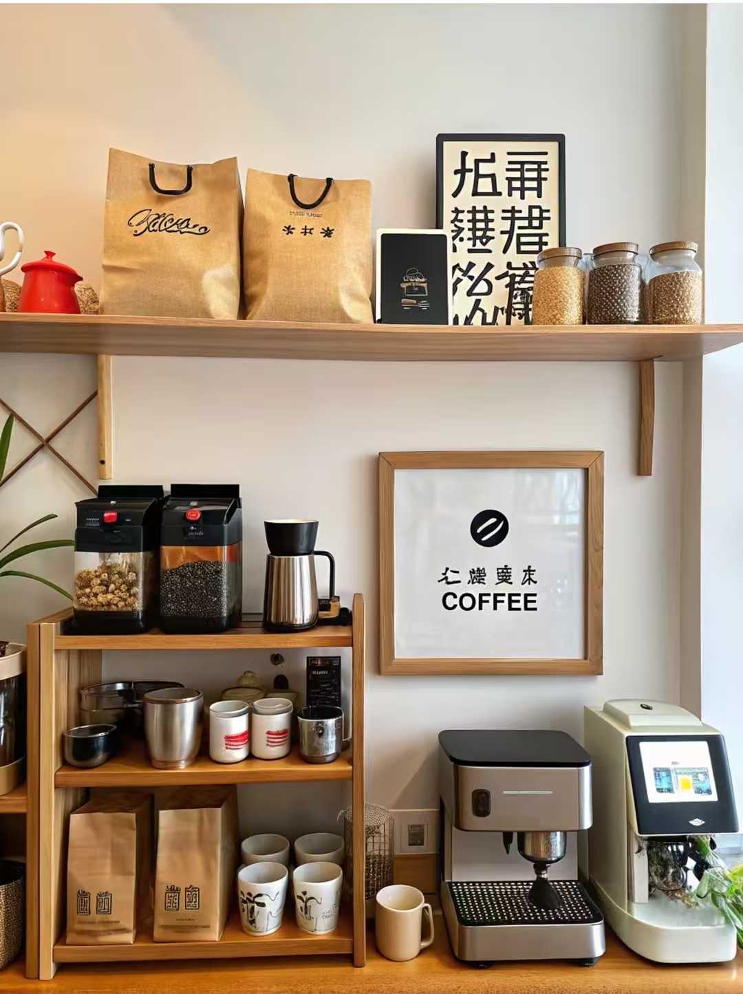 Στα ξύλινα ράφια εμφανίζονται μια σειρά από σκεύη καφέ και σακούλες συσκευασίας, σαν το πλούσιο άρωμα του καφέ να διαπερνά τον αέρα, προσθέτοντας μια μοναδική γεύση σε αυτό το σπίτι.