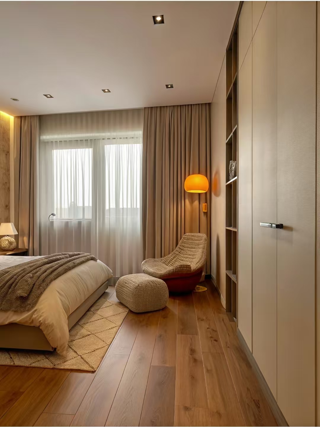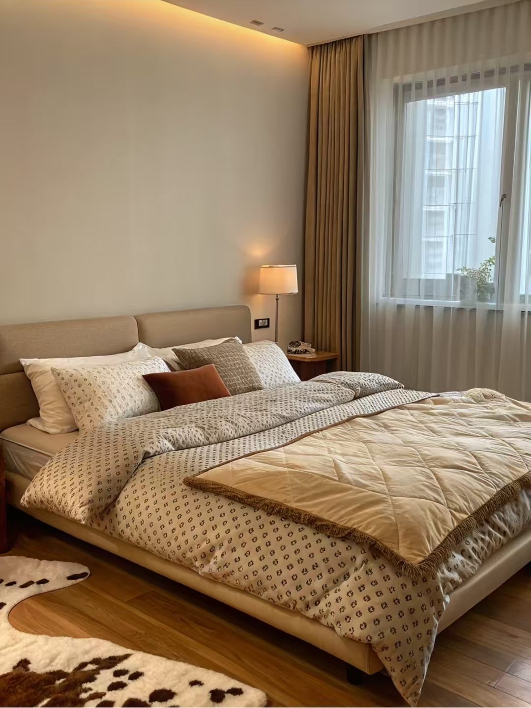 Ο μαλακός φωτισμός και το άνετο κλινοσκεπάσματα βοηθούν να ρίξουν την κόπωση της ημέρας. Οι τεράστιες κουρτίνες από το παράθυρο κυματίζουν απαλά στο αεράκι, με το ηλιακό φως να ρέει μέσα από τα κενά, δημιουργώντας μια γαλήνια και όμορφη ατμόσφαιρα.