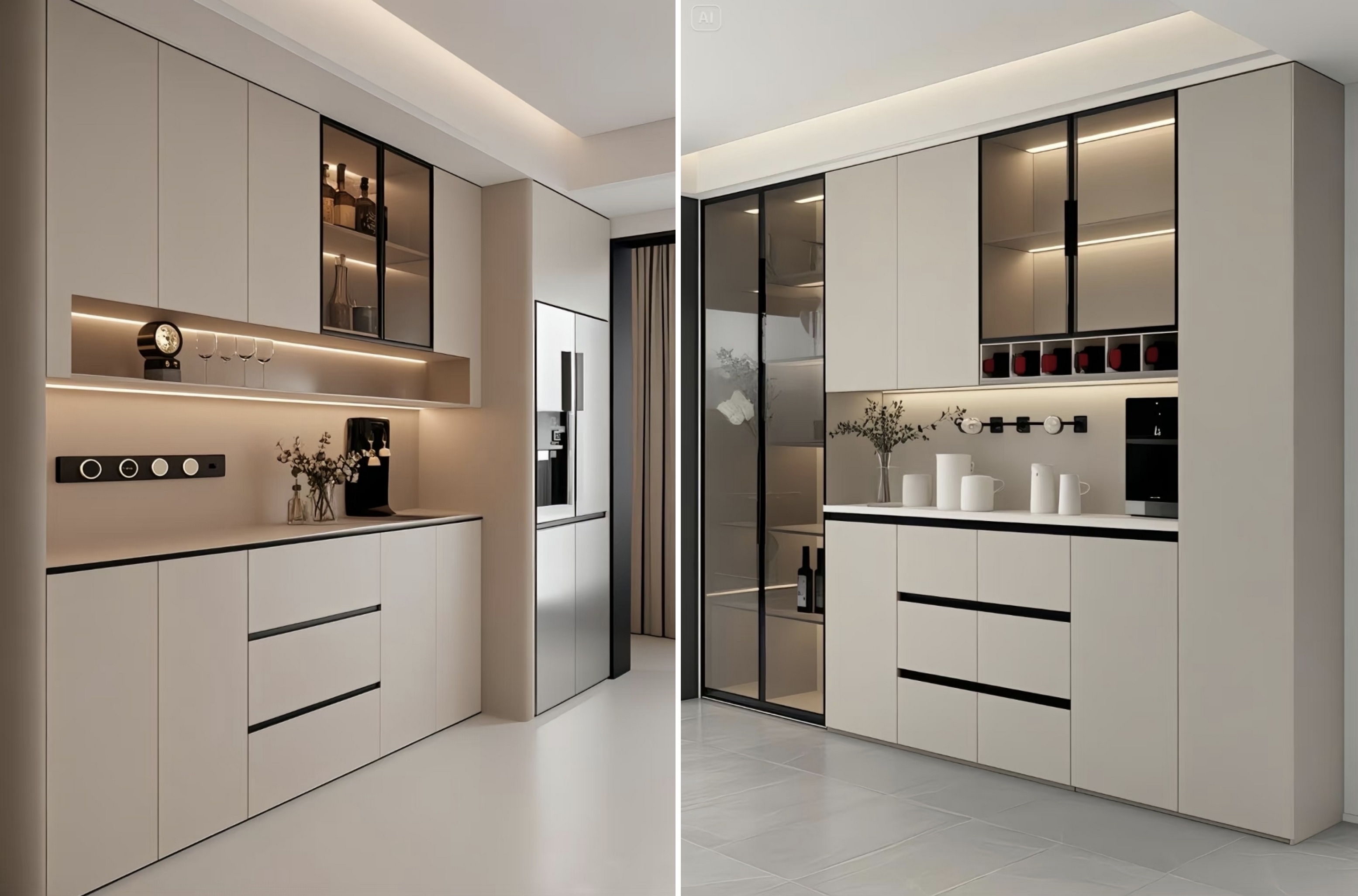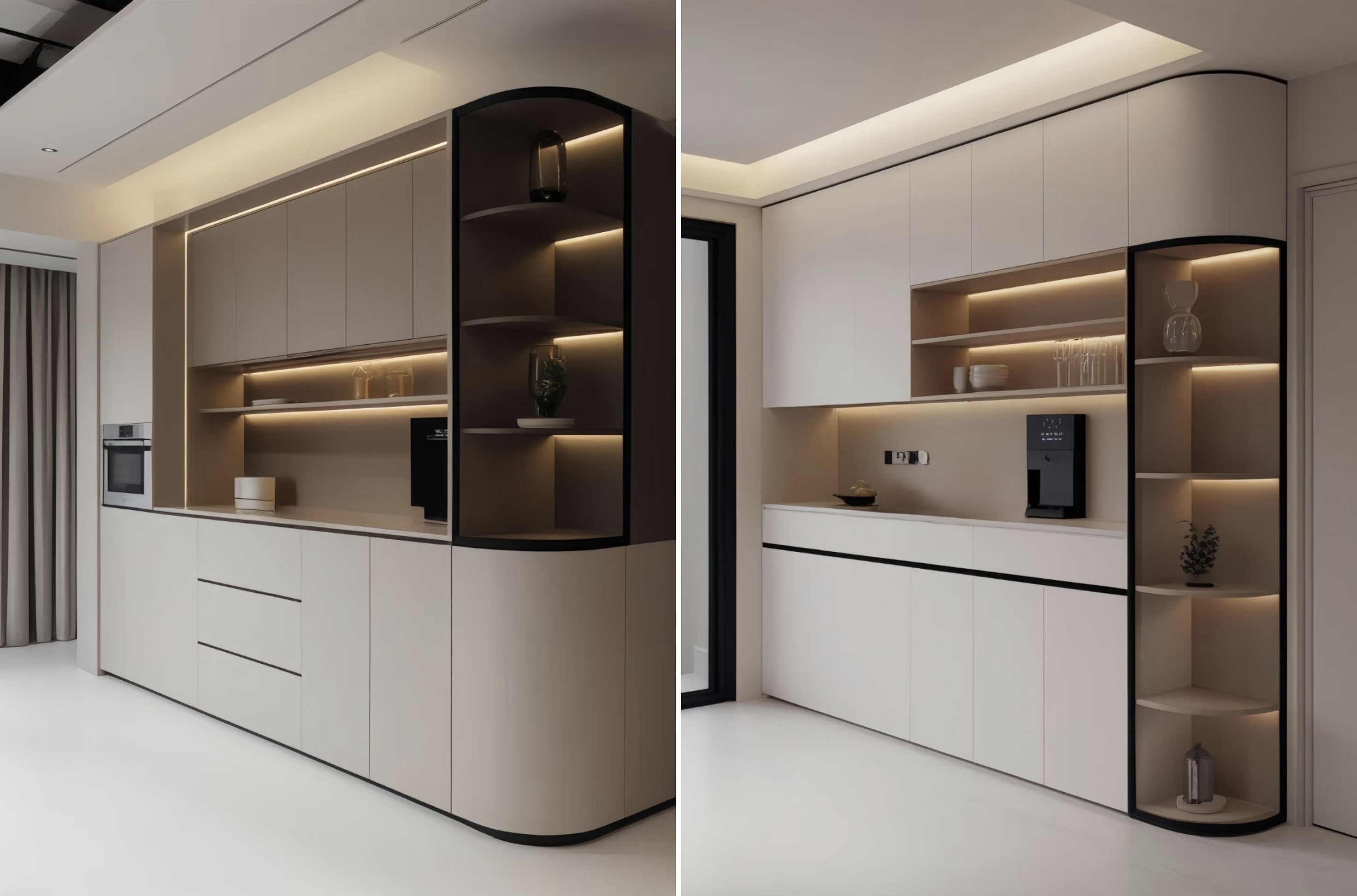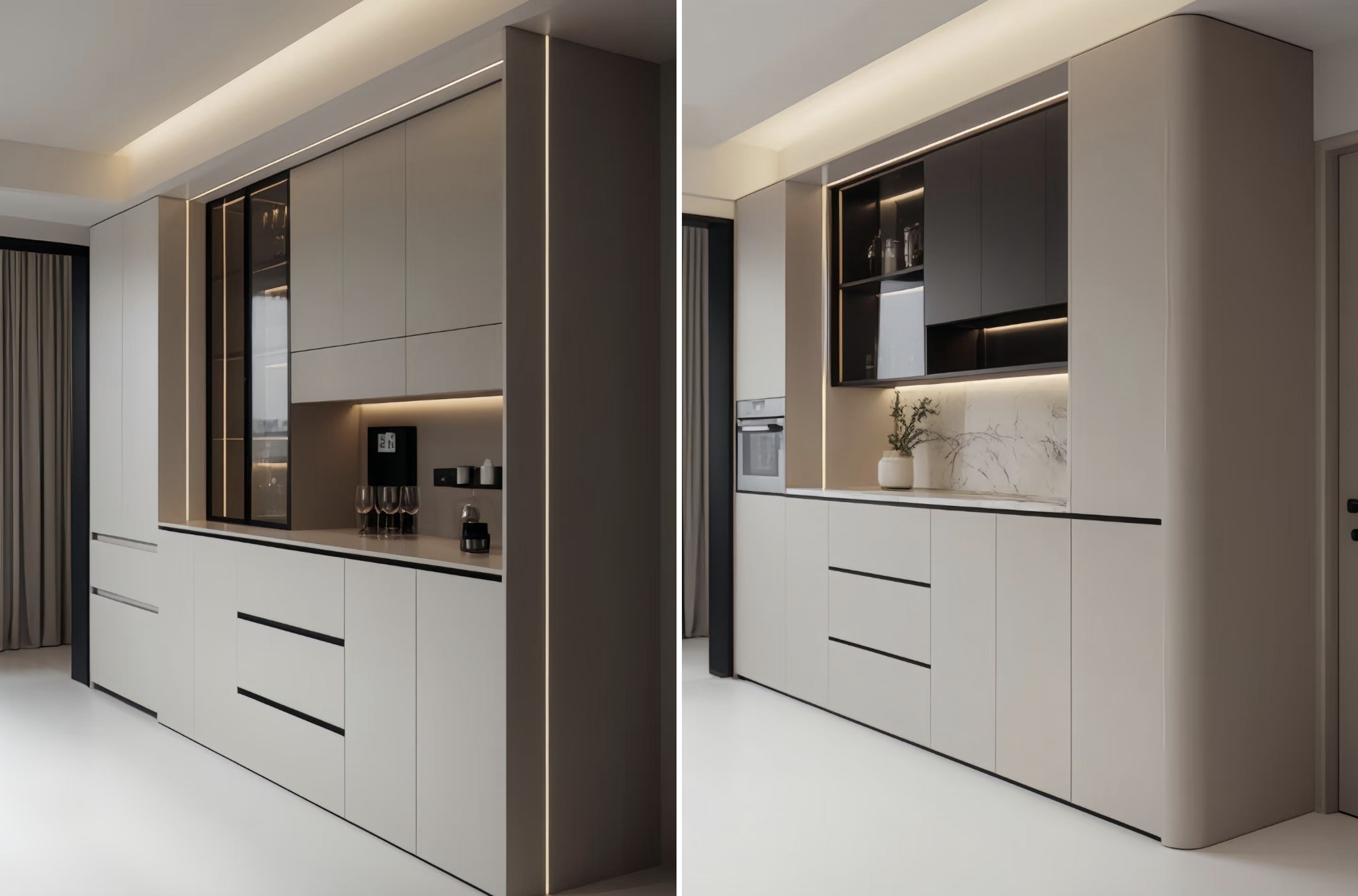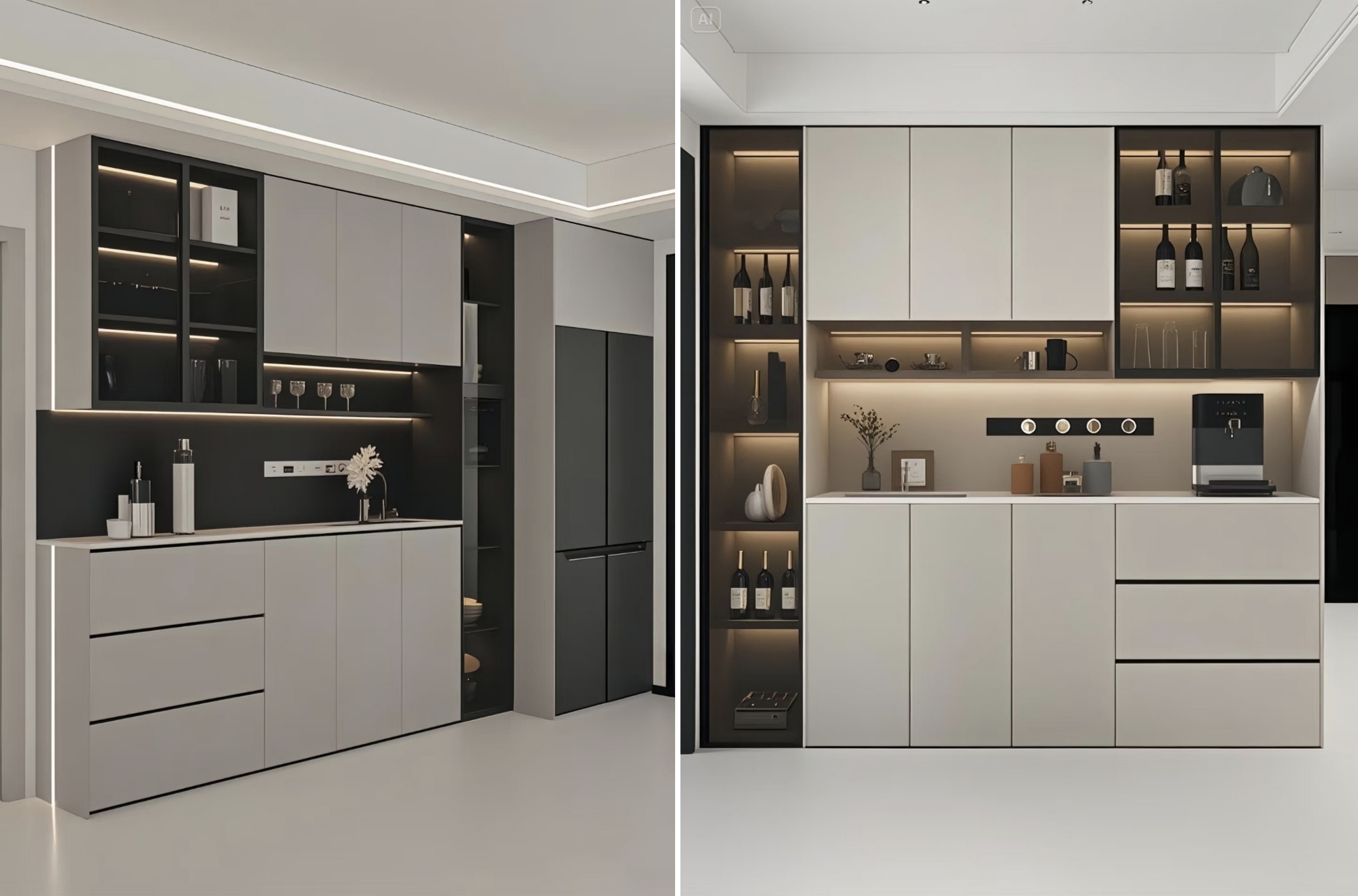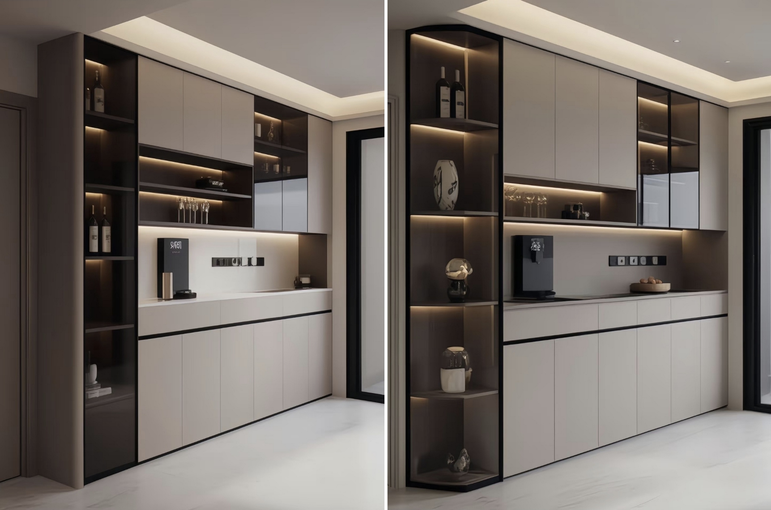 Συνδυάζοντας κλειστά ντουλάπια με ανοιχτά ράφια, παρέχει αρκετό χώρο για την αποθήκευση επιτραπέζιων λογισμικών, κρασιού και μικρών συσκευών. Οι ανοιχτές περιοχές μπορούν επίσης να εμφανίζουν διακοσμητικά αντικείμενα, προσθέτοντας ένα άγγιγμα ζωής στο χώρο.